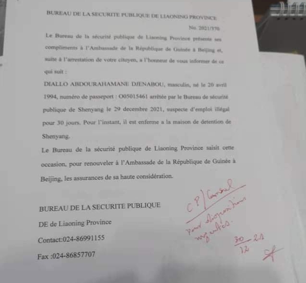 Abdourahmane DIALLO, âgé de 28 ans est en Chine il y a de cela 6 ans pour les Études de Master en informatique. Il suivait d’autres formations avec des travaux dans la ville de Liaoning province. Suspecté d’emploi illégal pour 30 jours, il a été arrêté le 29 décembre 2021 et détenu par le bureau de la sécurité publique de Shenyang.