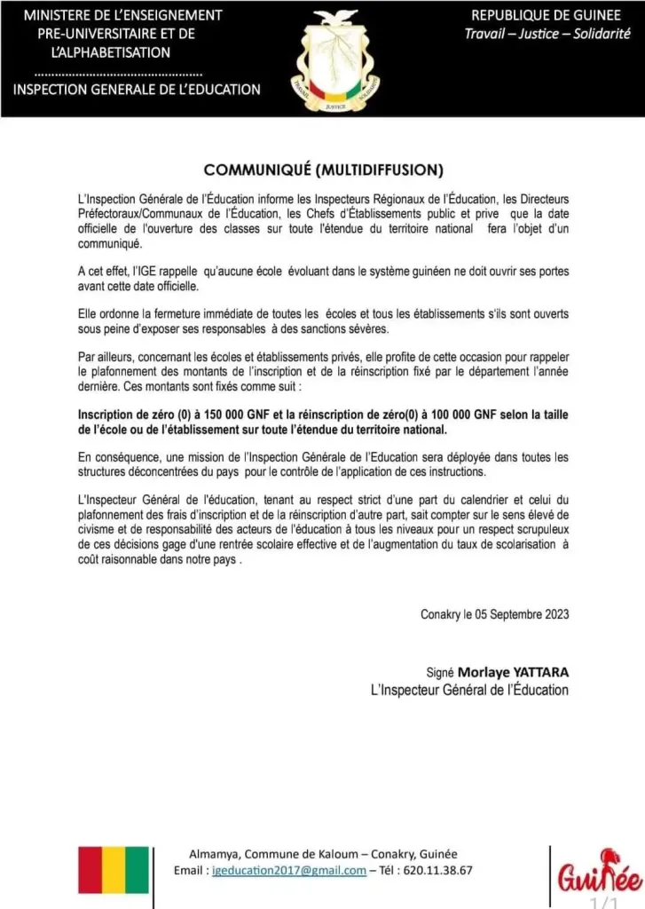 Le communiqué signé par l’inspecteur général l’éducation, adressé aux inspecteurs Régionaux de l’Éducation, Directeurs Préfectoraux et Communaux de l’Éducation, Chefs d’établissements public et prive, note que la date officielle de l’ouverture des classes sur toute l’étendue du territoire national fera l’objet d’un communiqué.