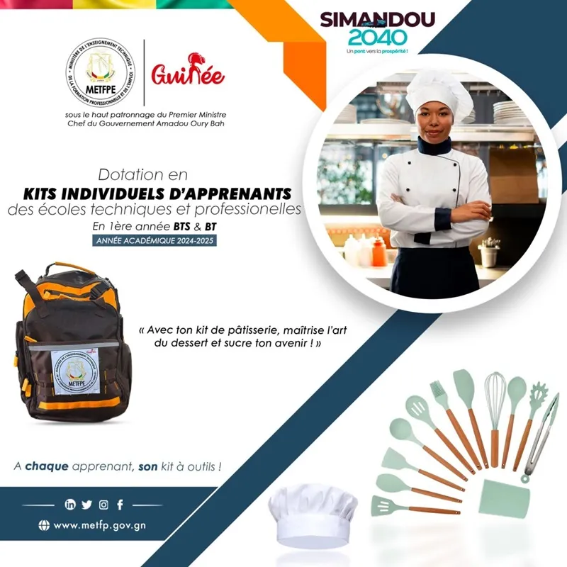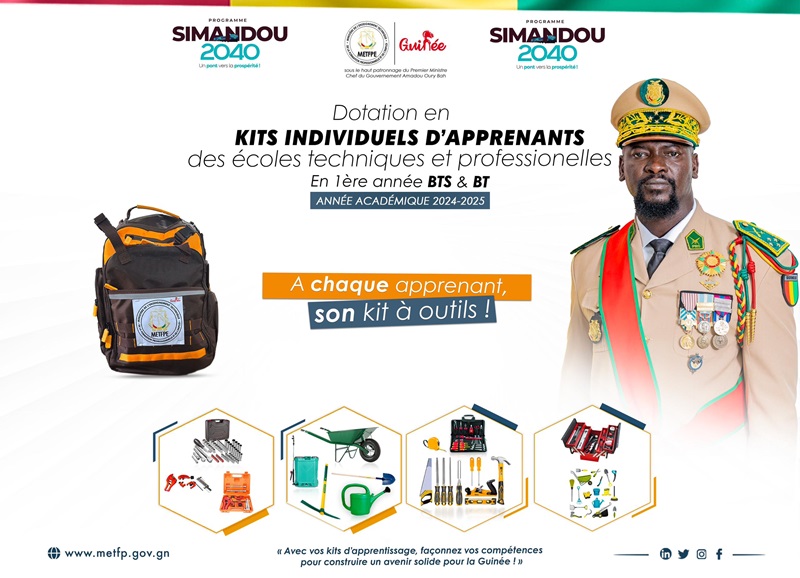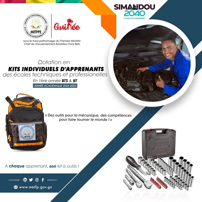 Dans le cadre de sa vision pour l’avenir, le gouvernement guinéen, par l’intermédiaire du Ministère de l’Enseignement Technique, de la Formation Professionnelle et de l’Emploi, annonce une initiative significative : la dotation de kits individuels pour les apprenants. Cette démarche répond à la nécessité de former des jeunes qualifiés, en adéquation avec les exigences du programme Simandou 2040.