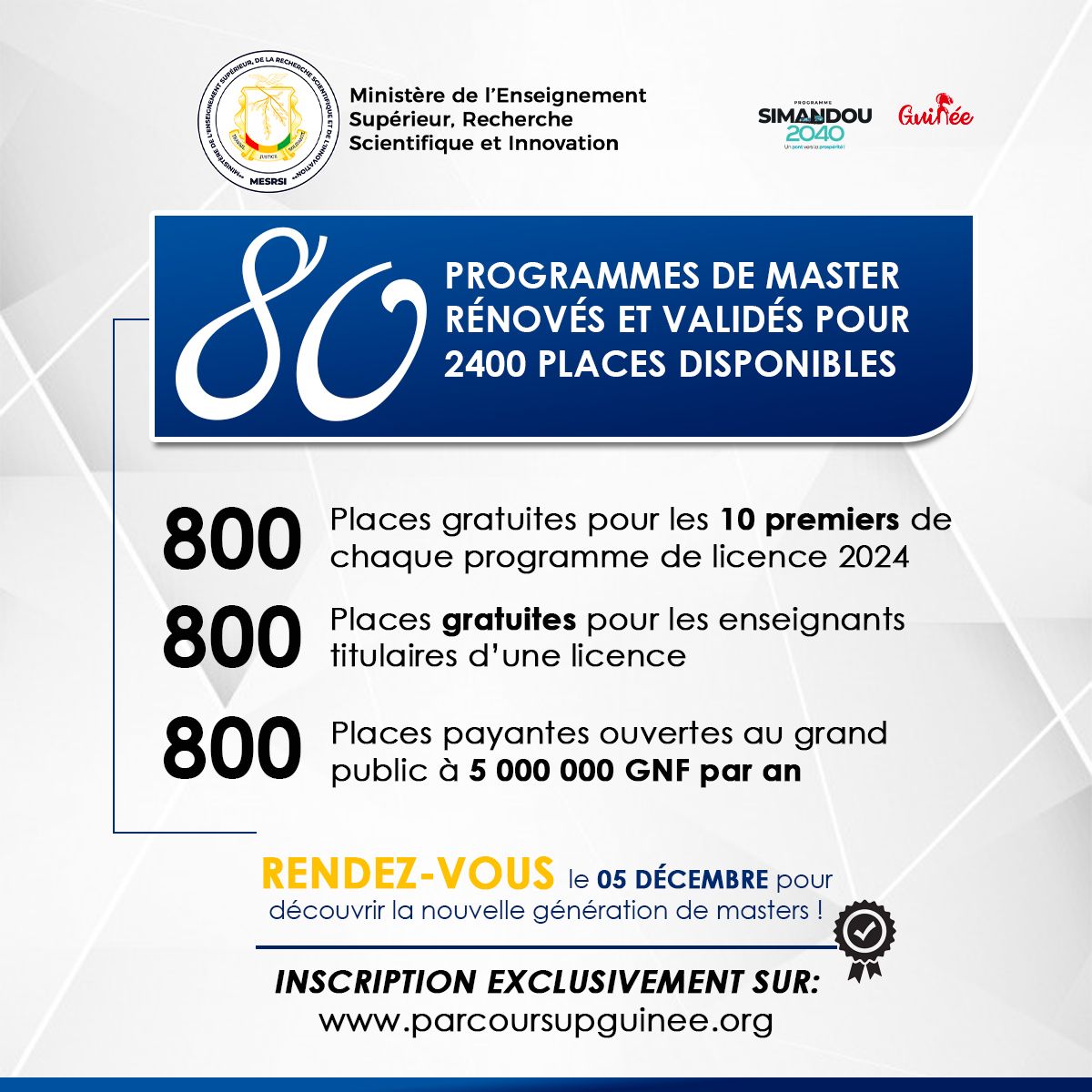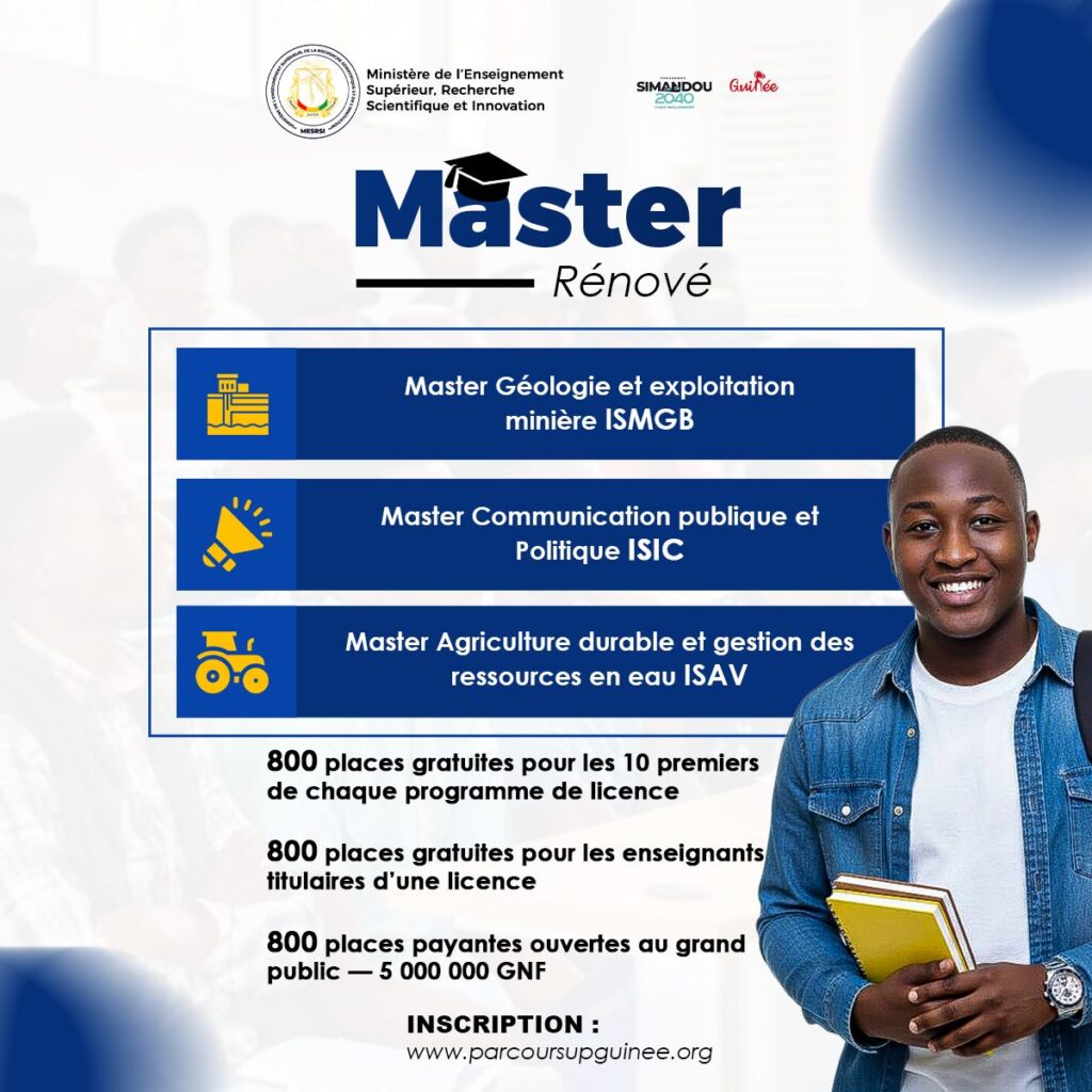 Le MinistĂšre de lâEnseignement SupĂ©rieur, de la Recherche Scientifique et de lâInnovation annonce une rĂ©forme majeure dans le paysage acadĂ©mique guinĂ©en. 80 programmes de master ont Ă©tĂ© entiĂšrement rĂ©novĂ©s, intĂ©grant de nouveaux contenus pĂ©dagogiques alignĂ©s sur les standards internationaux et les exigences du marchĂ© de lâemploi.