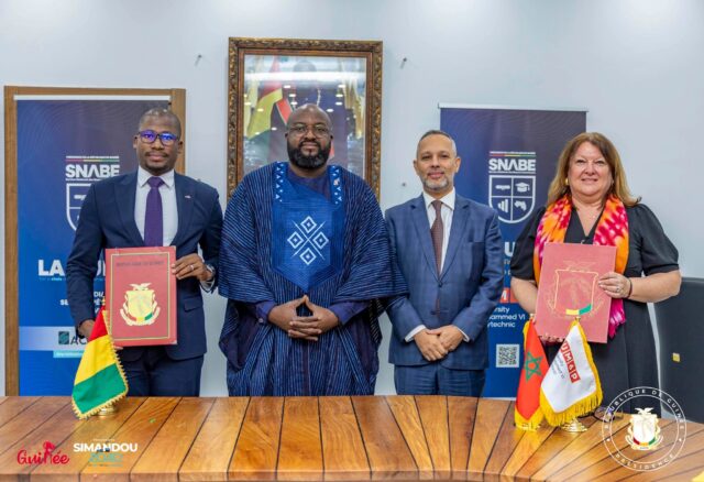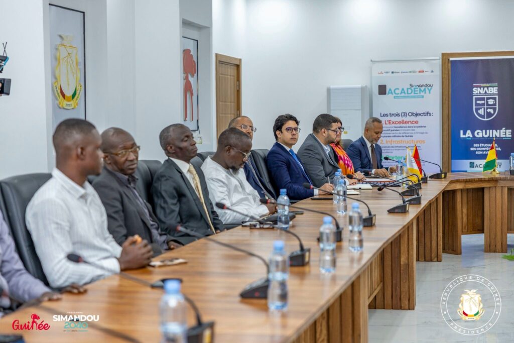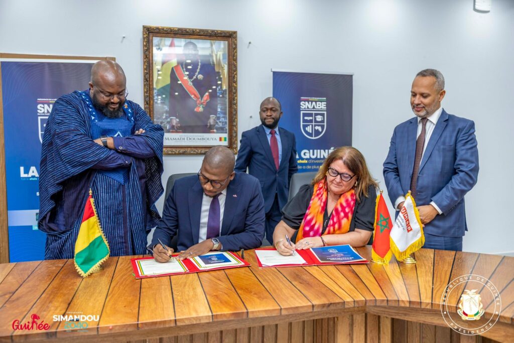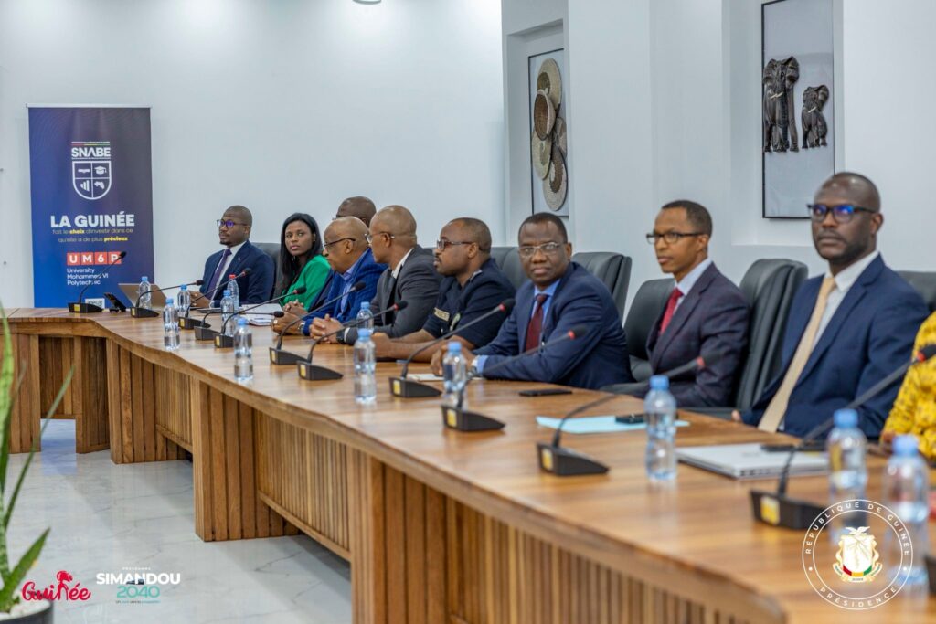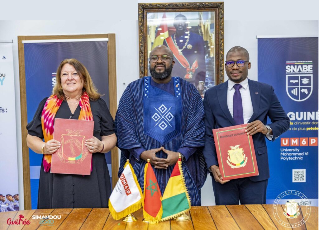 La RĂŠpublique de GuinĂŠe a franchi une ĂŠtape majeure dans le renforcement de la coopĂŠration acadĂŠmique Sud-Sud avec le Royaume du Maroc. Sous la conduite de Monsieur Djiba DIAKITĂ, Ministre Directeur de Cabinet de la PrĂŠsidence de la RĂŠpublique et PrĂŠsident du ComitĂŠ StratĂŠgique de Simandou, sâest tenue ce mercredi 4 fĂŠvrier 2026 la cĂŠrĂŠmonie officielle de signature de la convention de partenariat entre le Service National des Bourses ExtĂŠrieures (SNABE) et lâUniversitĂŠ Mohammed VI Polytechnique (UM6P) du Royaume du Maroc. La cĂŠrĂŠmonie sâinscrit dans le cadre du dĂŠploiement de lâinitiative Simandou Academy, un volet central du Programme Simandou 2040, et sâest dĂŠroulĂŠe en prĂŠsence des conseillers de la PrĂŠsidence, de lâAmbassadeur du Royaume du Maroc en RĂŠpublique de GuinĂŠe, des cadres du SNABE ainsi que dâune importante dĂŠlĂŠgation de lâUniversitĂŠ Mohammed VI Polytechnique et des membres du Conseil dâAdministration du SNABE.